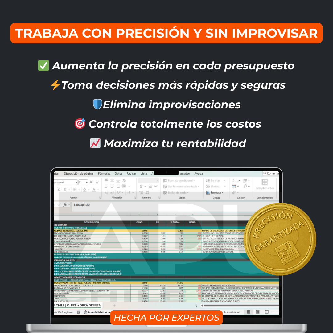 Ha sido rigurosamente desarrollada por expertos en estimación de costos, con el objetivo de entregar un apoyo realista, preciso y profesional para la elaboración de presupuestos en proyectos de gran envergadura, específicamente en obras preliminares y obra gruesa.