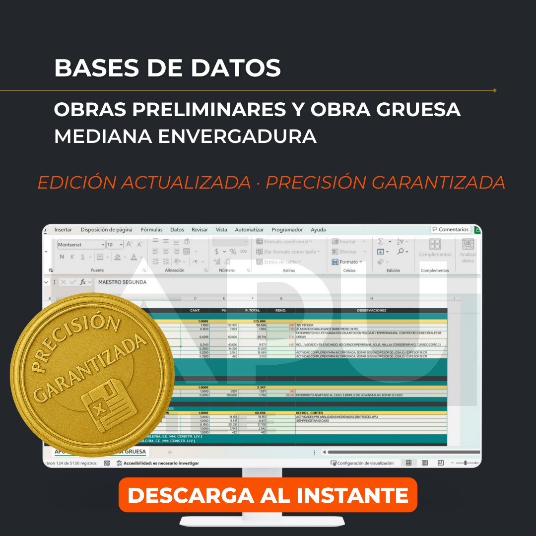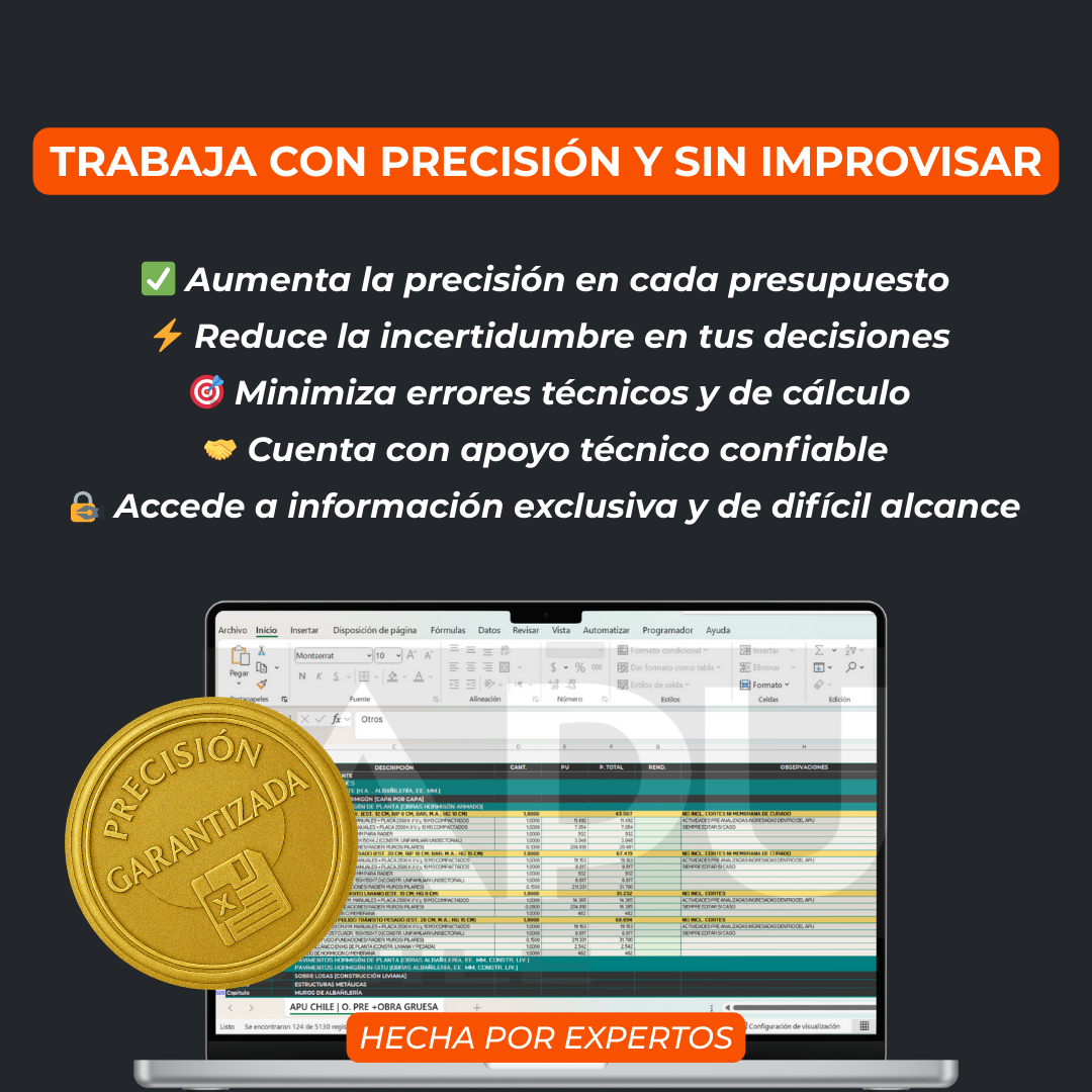Ha sido rigurosamente desarrollada por expertos en estimación de costos, con el objetivo de entregar un apoyo realista, preciso y profesional para la elaboración de presupuestos en proyectos de mediana envergadura, específicamente en obras preliminares y obra gruesa. Ideal para quienes gestionan obras de forma autónoma o están en etapa de crecimiento.