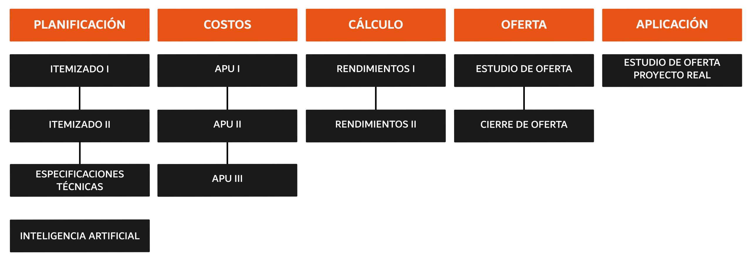 Cada módulo combina formación técnica exigente y práctica constante, basada en casos reales del rubro construcción. El estudiante aprende a pensar como responsable de costos, no como operador.